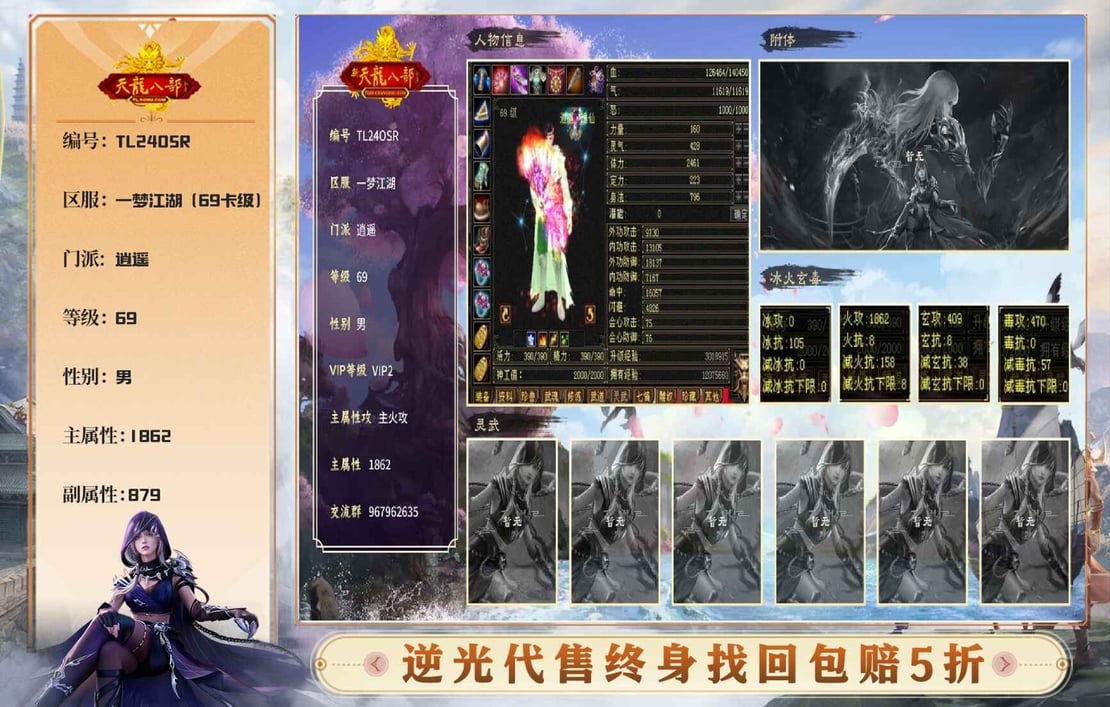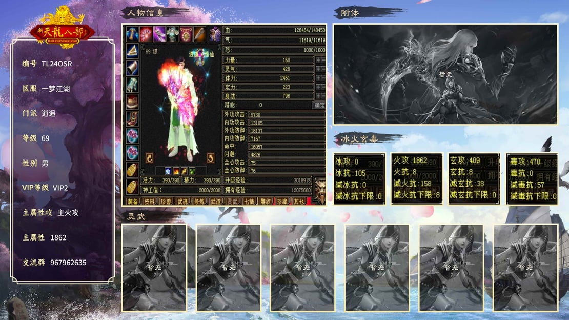 69卡级逍遥,带永久时装,不加转态主火攻1862性价比高,14万血刷副本好组队,放大几率高。